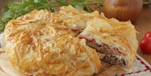 Всяка кора се разстила по дължина и се намазва с олио. Прегъва се на две – съединяват се двете къси страни (виж снимките). Отгоре повторно се намазва. След това се нарязва на 4 еднакви ленти, успоредно на новополучената къса страна. В единия край на всяка лента се поставя по 1 ч.л. от пълнежа, след което се нагъва така, че да се получи триъгълна форма.